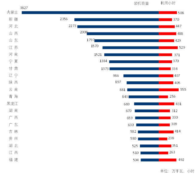 图3 1-2月份风电装机较多省份风电装机容量和设备利用小时