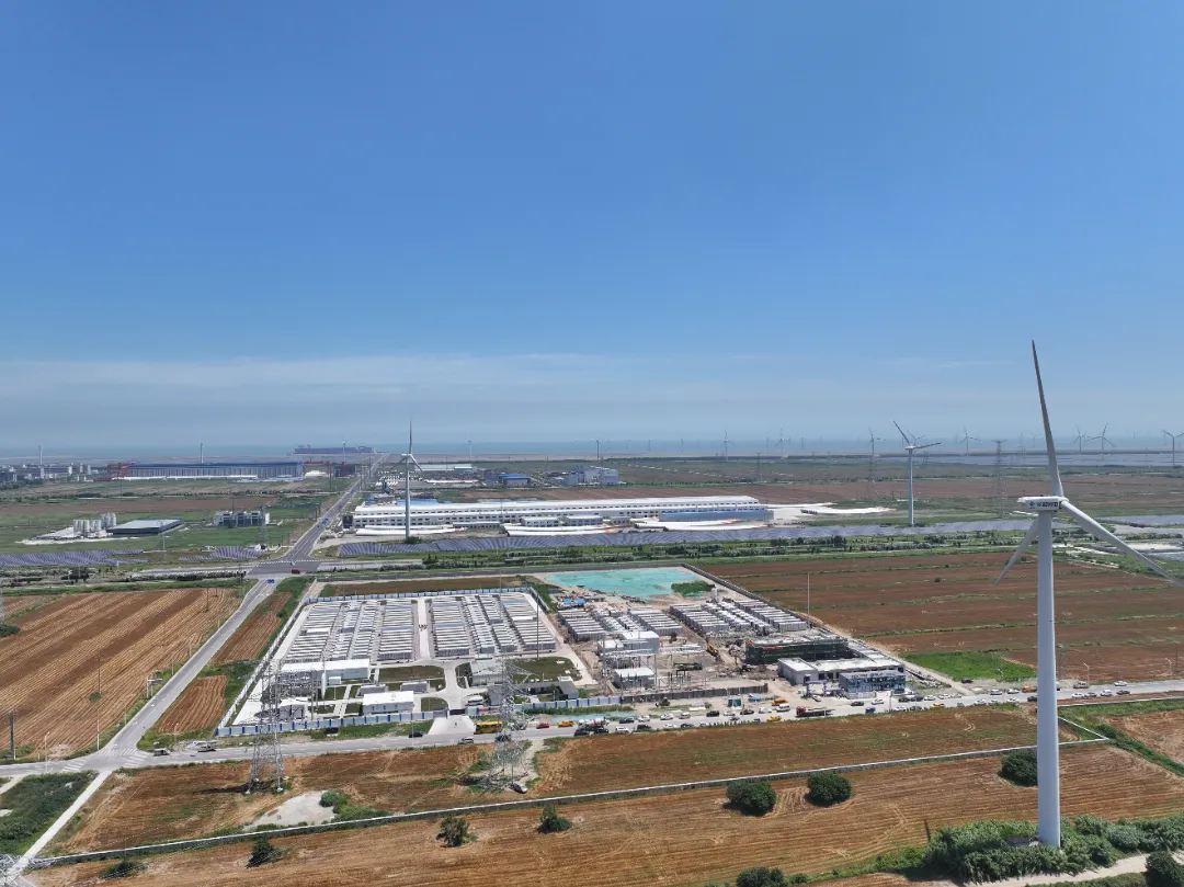 目光转向江苏南通,位于如东沿海经济开发区的江苏丰储共享储能电站内:80个大如厢式货车的巨型磷酸铁锂电池整齐排放,周围“风车”林立。
