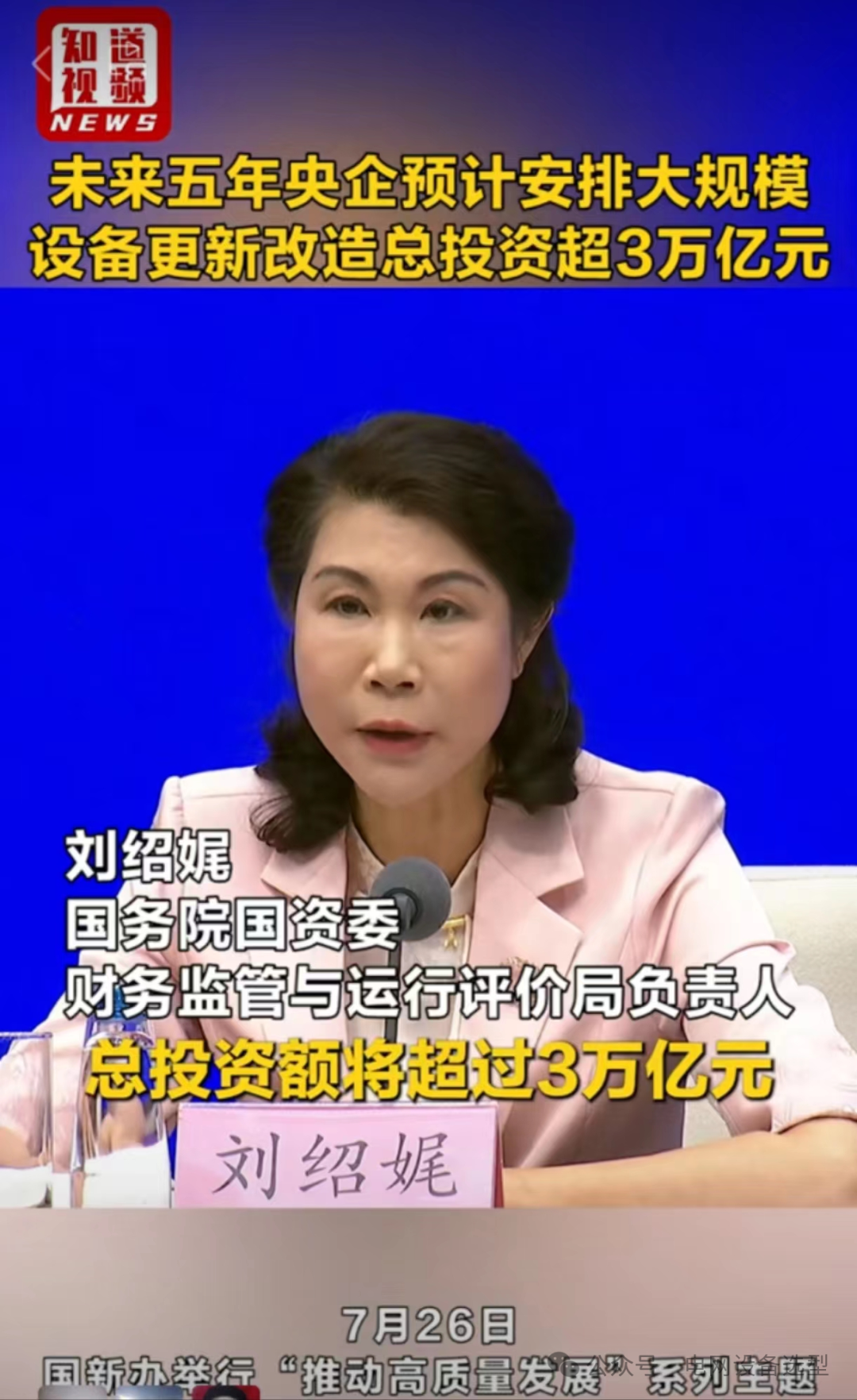 国务院国资委财务监管与运行评价局负责人:刘绍娓在答记者问时表示,近期,国务院国资委召开了中央企业大规模设备更新工作推进会议,主要目的是,指导中央企业率先行动,聚焦“五个加快”推动大规模设备更新重点任务落实落地。