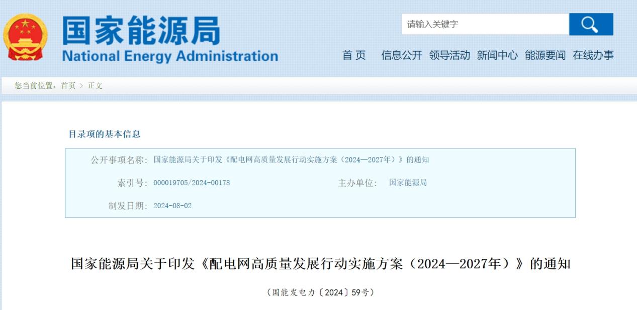 为落实《国家发展改革委 国家能源局 国家数据局关于印发〈加快构建新型电力系统行动方案(2024—2027年)〉的通知》(发改能源〔2024〕1128号)、《国家发展改革委 国家能源局关于新形势下配电网高质量发展的指导意见》(发改能源〔2024〕187号)有关要求,深入推进配电网高质量发展重点任务落地见效,国家能源局制定了《配电网高质量发展行动实施方案(2024—2027年)》。