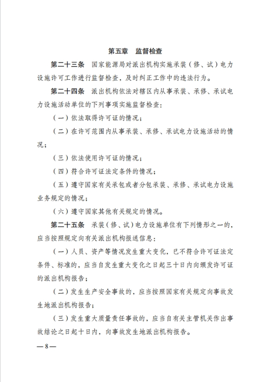 一是完善立法依据,细化许可范围。总则中增加《中华人民共和国能源法》作为立法依据,对承装、承修、承试电力设施的定义进行细化,进一步明确承揽发电项目升压站、外送线路等涉网工程需要取得许可证。