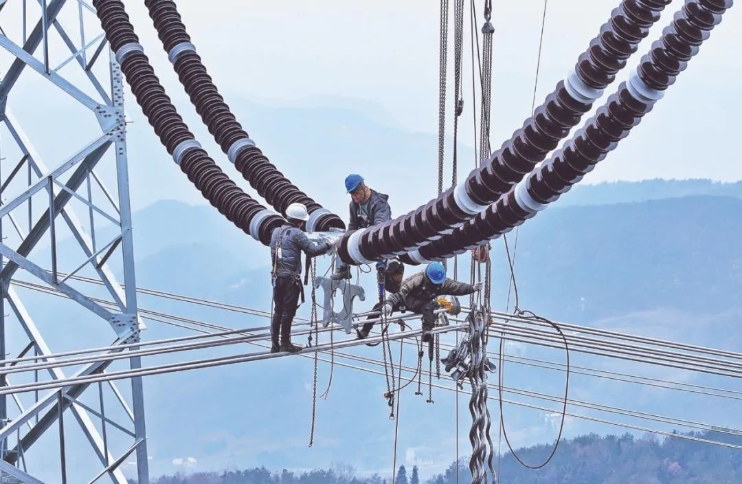 在±800千伏宁夏—湖南特高压直流输电工程鄂2标段施工现场,国网湖北送变电公司员工在高空开展导地线附件安装作业