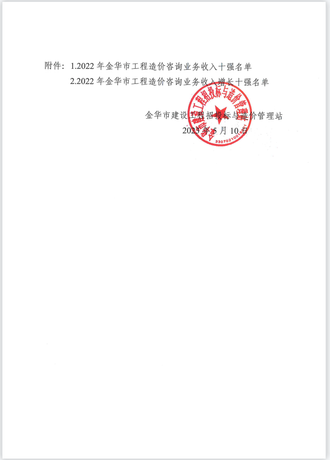 5月10日,市造价管理站发出通知,对2022年度金华市咨询业务收入十强及增长十强的企业给予表彰,我公司荣获2022年金华市工程造价咨询业务收入十强企业。